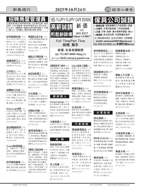 者請電732-789-8886 招聘居家手工串珠 1560 Edison請老人陪護 1561 快捷。電話:646-825-1939 各種急修,誠信價平。