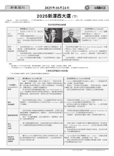 (上接1版) 兩位主流州長候選人——民主黨的謝里爾Mikie Sherrill 和共和黨的奇亞塔雷利Jack Ciattarelli——在個人背景、政治經驗與主要政見上的比較(由於選