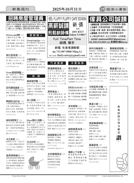 732-301-9268 聘做飯阿姨 1561 話:手機848-391-3777, 意者請電 732-599-3189 917-251-0514